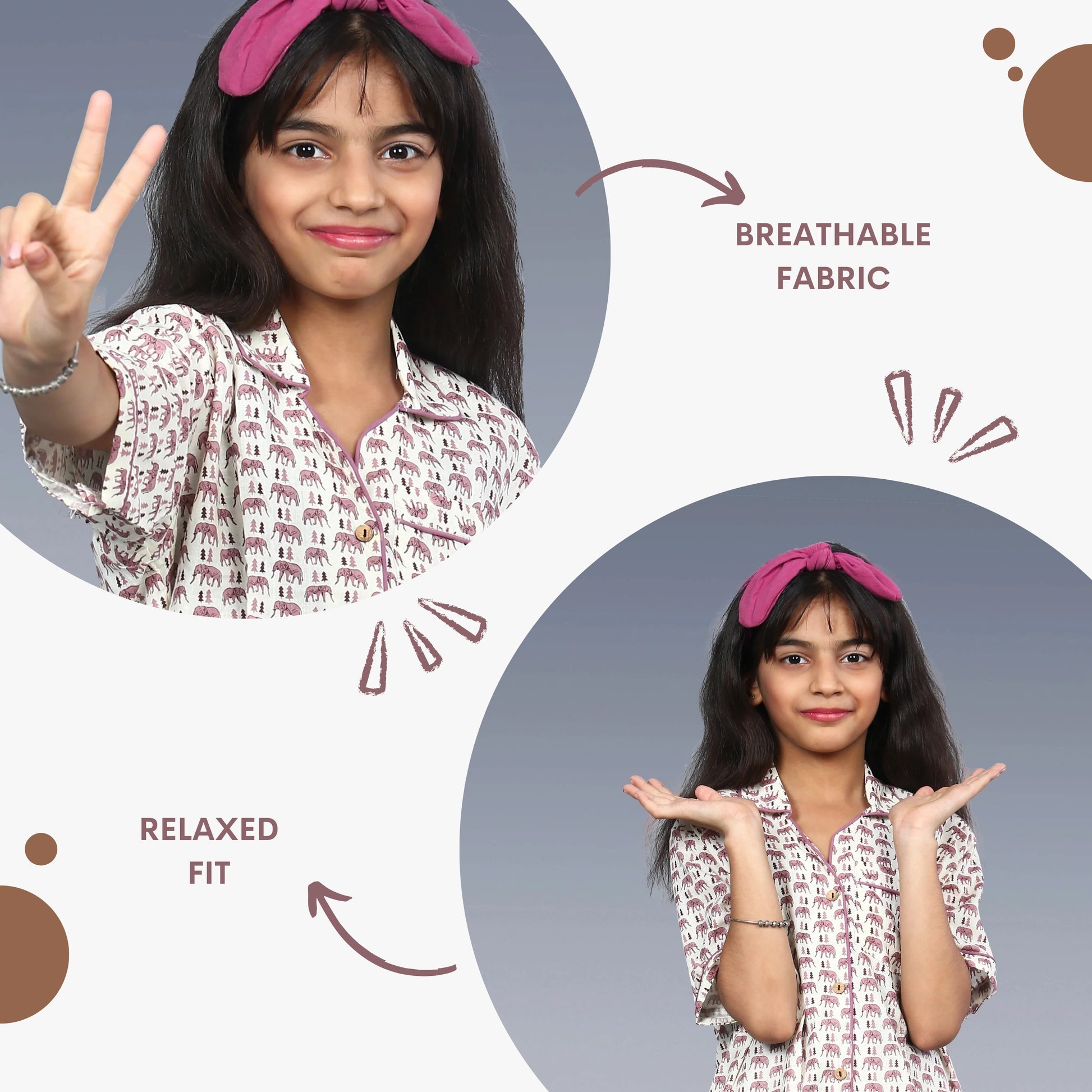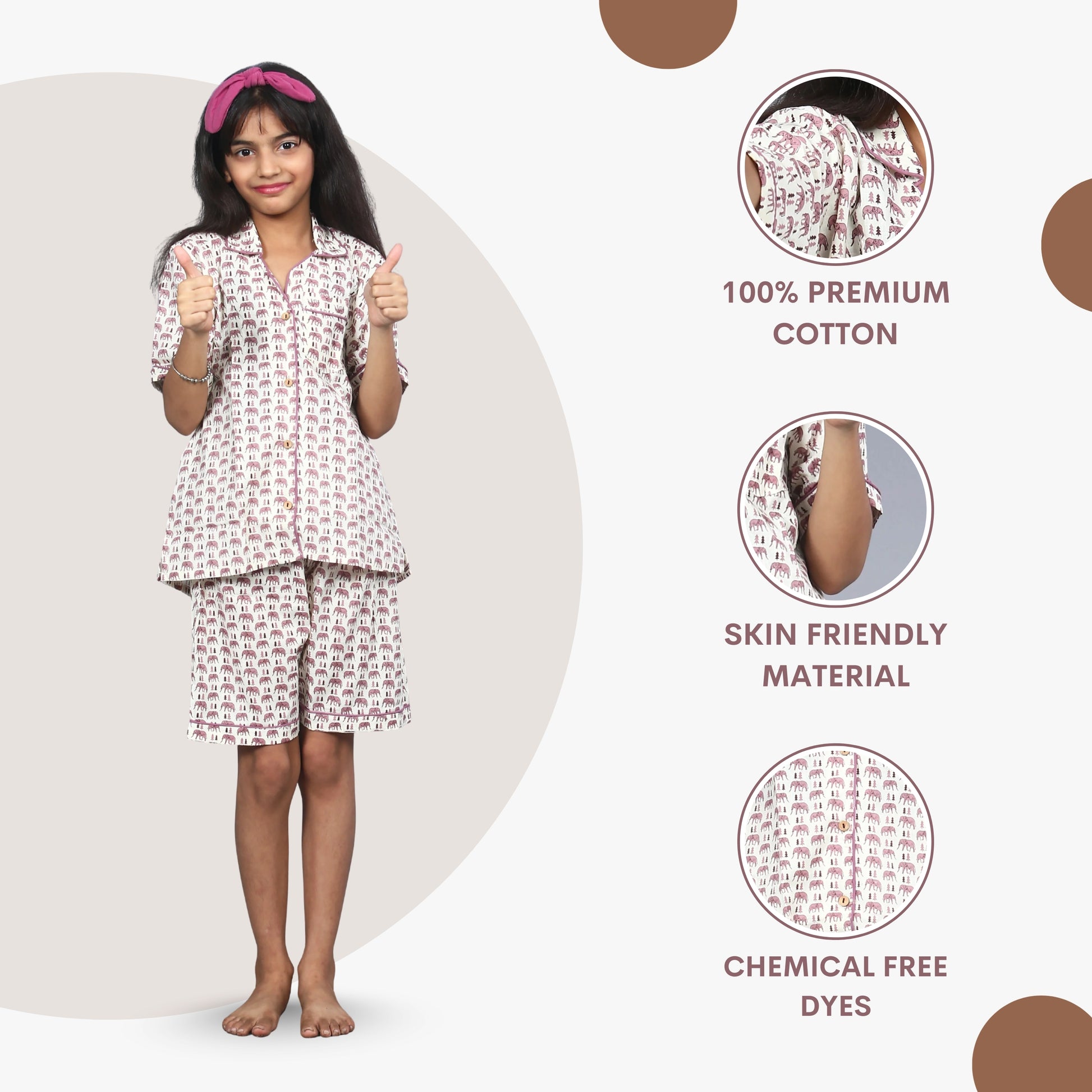 Kids Everyday Essentials Cotton printed night suit sets. Half sleeves with pajama collar. Front open shirt with wooden buttons.